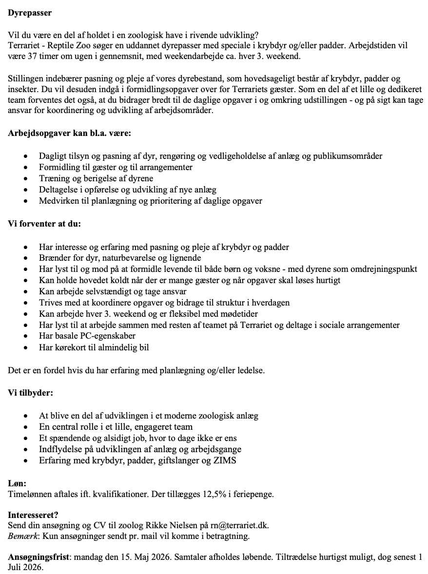 uopfordrede Ansøgninger som dyrepasser-lærling bedes sendt til dyr@terrariet.dk